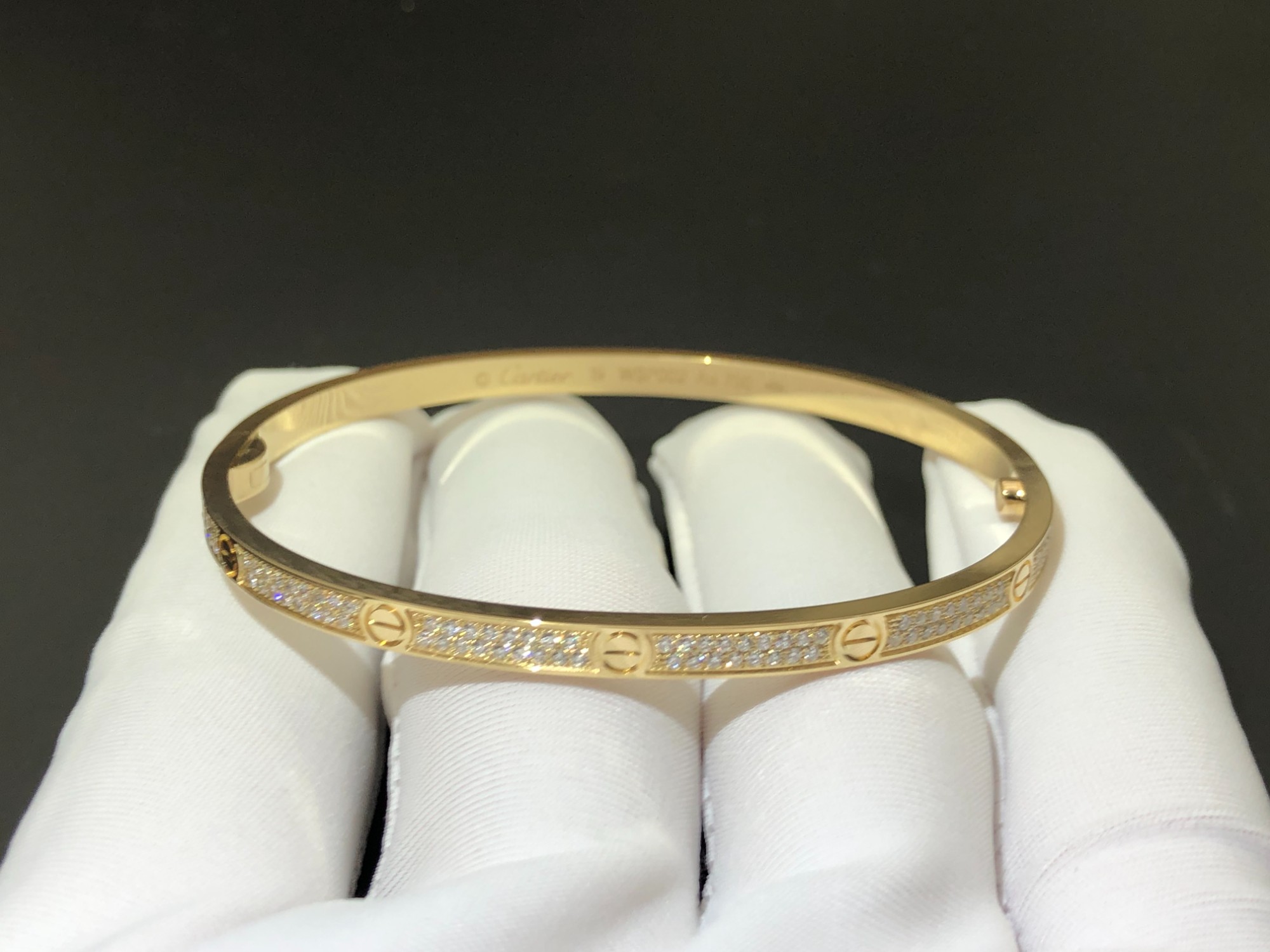 Gold, diamonds #LOVE# bangle, small size, 750‰ gold, set with 177 round bright cut diamonds, total weight 0.95 carats. Come with a screwdriver. Width: 3.65mm (applicable size: 17)