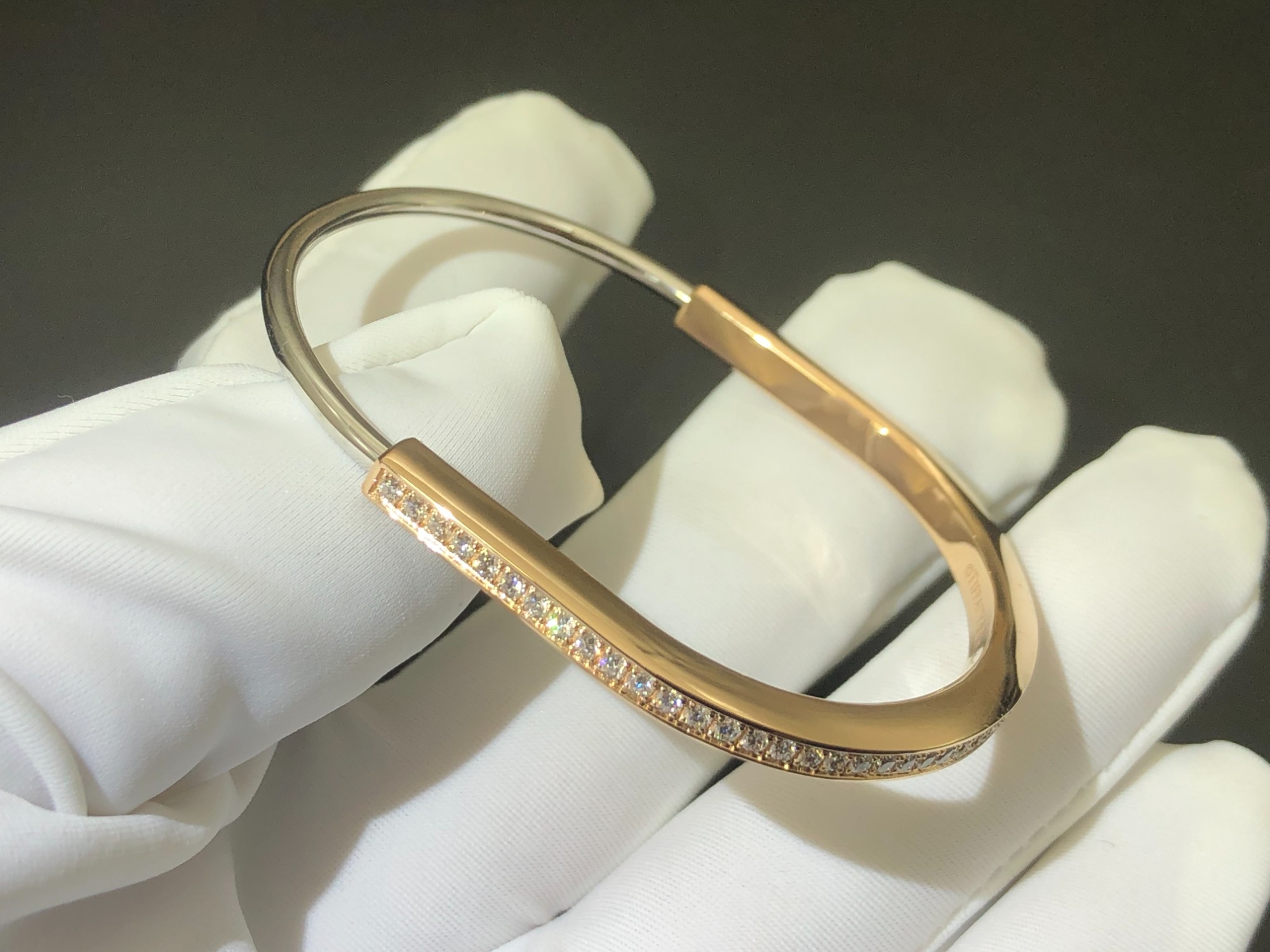 Narrow bracelet 18K rose gold and 18K white gold with half-pavé diamonds